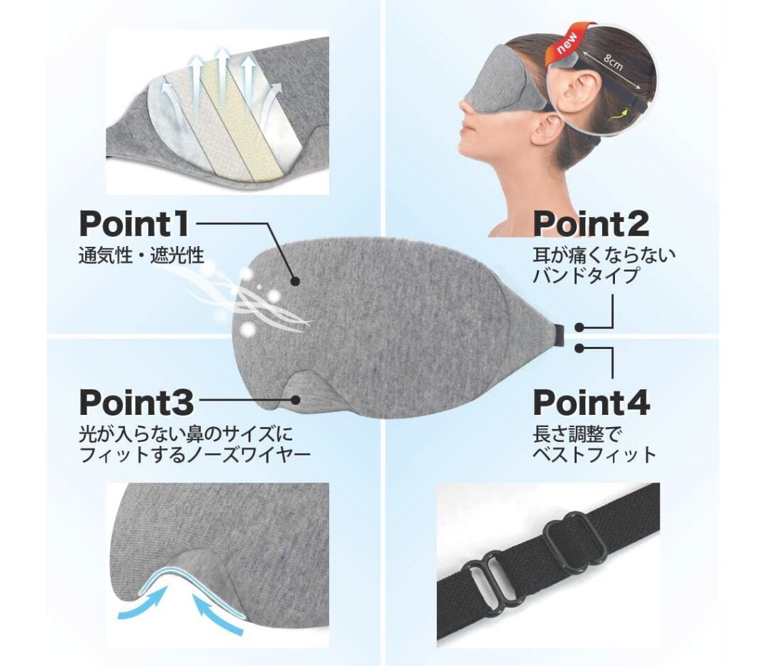 【薄型伸縮バンドで調整可能】バンド部分はストレッチ性に優れた薄型伸縮バンドを採用。留め具による長さ調整も可能です。その人の頭囲に合わせたピッタリのサイズ感でベストフィットの付け心地。頭部を締め付けすぎることなく頭も痛くならないアイマスクです。